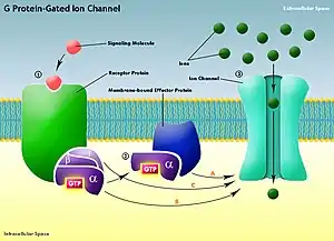 G protein-gated ion channels are associated with a specific type of G protein-coupled receptor. These ion channels are transmembrane ion channels with selectivity filters and a G protein binding site. The GPCRs associated with G protein-gated ion channels are not involved in signal transduction pathways. They only directly activate these ion channels using effector proteins or the G protein subunits themselves (see picture). Unlike most effectors, not all G protein-gated ion channels have their activity mediated by Gα of their corresponding G proteins. For instance, the opening of inwardly rectifying K+ (GIRK) channels is mediated by the binding of Gβγ.[3]