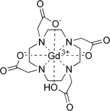 Gadoteric acid, sold under the brand name Dotarem among others, is a macrocycle-structured gadolinium-based MRI contrast agent (GBCA). It consists of the organic acid DOTA as a chelating agent, and gadolinium (Gd3+), and is used in form of the meglumine salt (gadoterate meglumine).[3][4] The paramagnetic property of gadoteric acid reduces the T1 relaxation time (and to some extent the T2 and T2* relaxation times) in MRI, which is the source of its clinical utility. Because it has magnetic properties, gadoteric acid develops a magnetic moment when put under a magnetic field, which increases the signal intensity (brightness) of tissues during MRI imaging.[6]