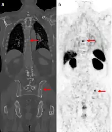 In the past, the gallium scan was the gold standard for lymphoma staging, until it was replaced by positron emission tomography (PET) using fludeoxyglucose (FDG).[9][10] Gallium imaging is still used to image inflammation and chronic infections, and it still sometimes locates unsuspected tumors as it is taken up by many kinds of cancer cells in amounts that exceed those of normal tissues. Thus, an increased uptake of gallium-67 may indicate a new or old infection, an inflammatory focus from any cause, or a cancerous tumor.