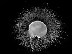 A dorsal root ganglion (DRG) from a chicken embryo (around stage of day 7) after incubation overnight in NGF growth medium stained with anti-neurofilament antibody. Note the axons growing out of the ganglion.