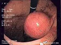 Endoscopic image of GIST in fundus of stomach, seen on retroflexion.
