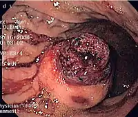 As the tumor grows it may project outside the bowel (exophytic growth) and/or inside the bowel (intraluminal growth), but they most commonly grow exophytically such that the bulk of the tumor projects into the abdominal cavity. If the tumor outstrips its blood supply, it can necrose internally, creating a central fluid-filled cavity with bleeding and cavitations that can eventually ulcerate and communicate into the lumen of the bowel. In that case, barium swallow may show an air, air-fluid levels or oral contrast media accumulation within these areas.[14][17] Mucosal ulcerations may also be present. In contrast-enhanced CT images, large GISTs appear as heterogeneous masses due to areas of living tumor cells surrounding bleeding, necrosis or cysts, which is radiographically seen as a peripheral enhancement pattern with a low attenuation center.[13] In MRI studies, the degree of necrosis and bleeding affects the signal intensity pattern. Areas of bleeding within the tumor will vary its signal intensity depending on how long ago the bleeding occurred. The solid portions of the tumor are typically low signal intensity on T1-weighted images, are high signal intensity on T2-weighted images and enhanced after administration of gadolinium. Signal-intensity voids are present if there is gas within areas of necrotic tumor.[15][18][19]