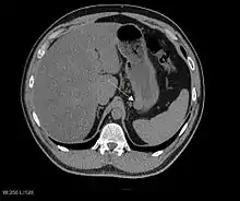 Non-enhanced CT image of a small GIST in the posterior stomach wall (arrow). The lesion appears subserosal. Incidental finding.