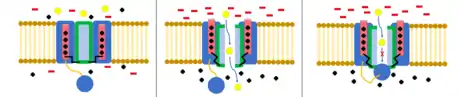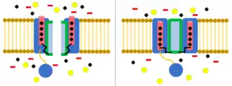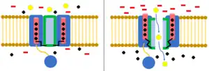 Voltage-gated ion channels open and close in response to the electrical potential across the cell membrane. Portions of the channel domain act as voltage sensors. As the membrane potential changes, this results in changes in electrostatic forces, moving these voltage-sensing domains. This changes the conformation of other elements of the channel to either the open or closed position.[8] When they move from the closed position to the open position, this is called "activation." Voltage-gated ion channels underlie many of the electrical behaviors of the cell, including action potentials, resting membrane potentials, and synaptic transmission.[9]