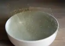 Gelatin is nearly tasteless and odorless with a colorless or slightly yellow appearance.[3][4] It is transparent and brittle, and it can come as sheets, flakes, or as a powder.[3] Polar solvents like hot water, glycerol, and acetic acid can dissolve gelatin, but it is insoluble in organic solvents like alcohol.[3] Gelatin absorbs 5–10 times its weight in water to form a gel.[3] The gel formed by gelatin can be melted by reheating, and it has an increasing viscosity under stress (thixotropic).[3] The upper melting point of gelatin is below human body temperature, a factor that is important for mouthfeel of foods produced with gelatin.[5] The viscosity of the gelatin-water mixture is greatest when the gelatin concentration is high and the mixture is kept cool at about 4 °C (39 °F). Commercial gelatin will have a gel strength of around 90 to 300 grams Bloom using the Bloom test of gel strength.[6] Gelatin's strength (but not viscosity) declines if it is subjected to temperatures above 100 °C (212 °F), or if it is held at temperatures near 100 °C for an extended period of time.[7][8]