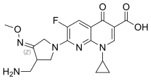 • Fc2c(nc1N(/C=C(/C(=O)O)C(=O)c1c2)C3CC3)N4C/C(=N\OC)C(C4)CN