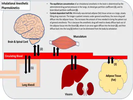 The partition coefficient of a gaseous drug is indicative of its relative solubility in various tissues. This metric is the relative drug concentration between two tissues, when their partial pressures are equal (gas:blood, fat:blood, etc.). Inhalational anesthetics vary widely with respect to their tissue solubilities and partition coefficients.[3] Anesthetics that are highly soluble require many molecules of drug to raise the partial pressure within a given tissue, as opposed to minimally soluble anesthetics which require relatively few.[4] Generally, inhalational anesthetics that are minimally soluble reach equilibrium more quickly. Inhalational anesthetics that have a high fat:blood partition coefficient, however, reach equilibrium more slowly, due to the minimal vascularization of fat tissue, which serves as a large, slowly-filling reservoir for the drug.[3]