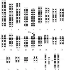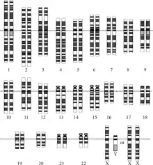 A typical human karyotype is shown here. Every chromosome has two copies. In the bottom right, there are chromosomal differences between males (XY) and females (XX), which do not concern us. A typical human karyotype is designated as 46,XX or 46,XY, indicating 46 chromosomes with an XX arrangement for females and 46 chromosomes with an XY arrangement for males.[2] For this article, we will use females for the karyotype designation (46,XX).
