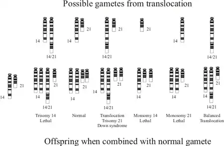 Translocation Down syndrome can be de novo; that is, not inherited but occurring at the time of an individual's conception, or may be inherited from a parent with a balanced translocation. The balanced translocation figure shows a 14/21 translocation between the long arms of chromosomes 14 and 21, where the other chromosomes are not shown. The individual has two copies of everything on chromosome 14, and two copies of all of the material on the long arm of chromosome 21 (21q). The derivative chromosome 21, which contains only heterochromatin, is lost; thus, the individual only has one copy of the material on the short arm of chromosome 21 (21p), but this appears to have no discernible effect. Individuals with this chromosomal arrangement have 45 chromosomes and are phenotypically normal. During meiosis, the chromosomal arrangement interferes with normal separation of chromosomes. Possible gametic arrangements are (see translocation karyotype figure):