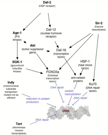 Long-lived mutants of C. elegans (age-1 and daf-2) were demonstrated to be resistant to oxidative stress and UV light.[7] These long-lived mutants had a higher DNA repair capability than wild-type C. elegans.[7] Knockdown of the nucleotide excision repair gene Xpa-1 increased sensitivity to UV and reduced the life span of the long-lived mutants. These findings support the hypothesis that DNA damage has a significant role in the aging process.[7]