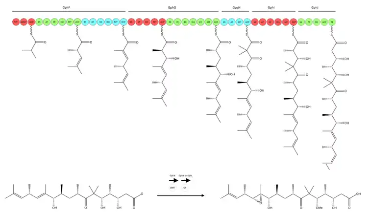 Gephyronic acid contains a methyl ether at C-5 and a C-12/C-13 epoxide. These functional groups are incorporated by post-PKS tailoring enzymes. GphA is likely responsible for installation of the C-5 methyl ether. O-methyltransferases SpiB and SpiK used in spirangien biosynthesis exhibit the same SAM-binding motif as GphA.[6]