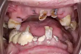 Although there is a decrease in the rate of edentulism, geriatric patients typically have high levels of plaque, calculus and debris, as they are functionally dependent on others or have lost the capacity to complete tasks such as toothbrushing thoroughly. Consequently, this results in an increased caries prevalence.[12] Dental caries is a process in which enamel is dissolved by acid producing bacteria. In 2004-2006, the average DMFT (decayed, missing and filled teeth) for adults in Australia over the age of 65 was found to be 23.7%.[12] An individual’s caries risk is influenced by their sugar intake, frequency of eating, oral hygiene levels, saliva flow and function and recession. Gingival recession is a significant finding in older adults because the exposed root surface is more susceptible to root caries and therefore increases the risk for the patient. In 2015, 95.2% of Australians over the age of 75 had at least one site with gingival recession.[12] Additionally, periodontal disease prevalence was also great as 26.0% of the geriatric population was diagnosed with active periodontal disease.[12]