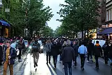 On 1 May 2020, when the German Trade Union Confederation did not hold its traditional demonstrations throughout Germany, a number of authorised and unauthorised gatherings took place in Berlin, Hamburg, Leipzig, Frankfurt and other German cities. In Berlin, 27 authorised protests were held, each capped at a maximum of 20 participants.[153] On May Day in Kreuzberg, several thousand protesters or spectators took part in demonstrations which, while unauthorised, were largely left alone by the police. Most of those gathered appeared to keep a safe distance from each other;[154] however, from the early evening onwards, many hundreds were observed not to do so, leading Berlin's Senator for the Interior Andreas Geisel to sharply condemn the protesters for their "geballte Unvernunft" ("bunched-up lack of common sense").[153]