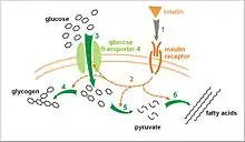 The precise mechanisms underlying gestational diabetes remain unknown. The hallmark of GDM is increased insulin resistance. Pregnancy hormones and other factors are thought to interfere with the action of insulin as it binds to the insulin receptor. The interference probably occurs at the level of the cell signaling pathway beyond the insulin receptor.[21] Since insulin promotes the entry of glucose into most cells, insulin resistance prevents glucose from entering the cells properly. As a result, glucose remains in the bloodstream, where glucose levels rise. More insulin is needed to overcome this resistance; about 1.5–2.5 times more insulin is produced than in a normal pregnancy.[21]