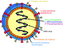 Figure 1. Structure of Henipavirus shows the attachment protein (G) and the Fusion protein (F) located on the viral capsid. Furthermore, replication proteins N, L, and P are shown associated with the viral RNA.