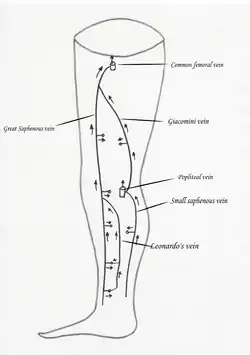 The Giacomini vein, or cranial extension of the small saphenous vein [1] is a communicating vein between the great saphenous vein (GSV) and the small saphenous vein (SSV). It is named after the Italian anatomist Carlo Giacomini (1840–1898). The Giacomini vein courses the posterior thigh as either a trunk projection, or tributary of the SSV. In one study it was found in over two-thirds of limbs.[2] Another study in India found the vein to be present in 92% of those examined.[3] It is located under the superficial fascia and its insufficiency seemed of little importance in the majority of patients with varicose disease, but the use of ultrasonography has highlighted a new significance of this vein.[4] It can be part of a draining variant of the SSV which continues on to reach the GSV at the proximal third of the thigh instead of draining into the popliteal vein. The direction of its flow is usually anterograde (the physiological direction) but it can be retrograde when this vein acts as a bypass from an insufficient GSV to SSV to call on this last one to collaborate in draining. Many discussions exist about this vein, some of them confusing to a non-expert reader.[5] Insufficiency in the Giacomini vein can present in isolation but is mostly seen together with a GSV insufficiency. It has been shown to be effectively treated either with endovenous laser ablation or by ultrasound guided sclerotherapy.[6]