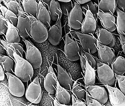Giardia (/dʒiːˈɑːrdiə/ or /ˈdʒɑːrdiə/) is a genus of anaerobic flagellated protozoan parasites of the phylum Metamonada that colonise and reproduce in the small intestines of several vertebrates, causing the disease giardiasis. Their life cycle alternates between a swimming trophozoite and an infective, resistant cyst. Giardia were first described by the Dutch microscopist Antonie van Leeuwenhoek in 1681.[3] The genus is named after French zoologist Alfred Mathieu Giard.[4]