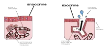 Here is a diagram that shows the differences between endocrine and exocrine glands. The major difference is that exocrine glands secrete substances out of the body and endocrine glands secrete substances into capillaries and blood vessels.