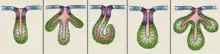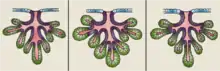 As growth proceeds, the column of cells may split or give off offshoots, in which case a compound gland is formed. In many glands, the number of branches is limited, in others (salivary, pancreas) a very large structure is finally formed by repeated growth and sub-division. As a rule, the branches do not unite with one another, but in one instance, the liver, this does occur when a reticulated compound gland is produced. In compound glands the more typical or secretory epithelium is found forming the terminal portion of each branch, and the uniting portions form ducts and are lined with a less modified type of epithelial cell.[2]