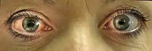 | Acute angle closure glaucoma of a person's right eye (shown at left). Note the mid-sized pupil, which is non-reactive to light, and redness of the white part of the eye. | |
