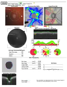 Screening for glaucoma is usually performed as part of a standard eye examination performed by optometrists and ophthalmologists. Testing for glaucoma includes measurements of the intraocular pressure using tonometry,[46] anterior chamber angle examination or gonioscopy as well as examination of the optic nerve to discern visible damage, changes in the cup-to-disc ratio, rim appearance and vascular change. A formal visual field test is performed. The retinal nerve fiber layer can be assessed with imaging techniques such as optical coherence tomography, scanning laser polarimetry or scanning laser ophthalmoscopy (Heidelberg retinal tomogram).[47][48][49] Visual field loss is the most specific sign of the condition, though it occurs later in the course of the disease.[50]