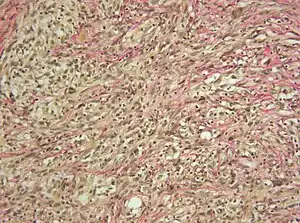 | Micrograph showing a gliosarcoma. Elastic van Gieson's stain. | |