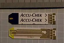 Two used Accu-Chek test strips. The lower one has had the cover peeled off to show the circuit.