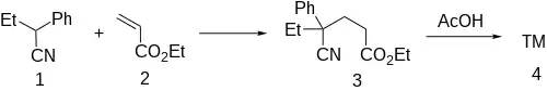 The base catalyzed conjugate addition of 2-phenylbutyronitrile [769-68-6] (1) to ethyl acrylate (2) gives ethyl 4-cyano-4-phenylhexanoate, CID:139890735 (3). Alkaline hydrolysis of the nitrile group into an amide group, and subsequent acidic cyclization of the product affords the desired glutethimide (4).