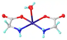 Glycine functions as a bidentate ligand for many metal ions, forming amino acid complexes. A typical complex is Cu(glycinate)2, i.e. Cu(H2NCH2CO2)2, which exists both in cis and trans isomers.