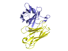 ![]() Cartoon representation of the antibody golimumab's variable fragment. The heavy and light chain fragments are coloured blue and yellow, respectively. From PDB entry 5yoy | |