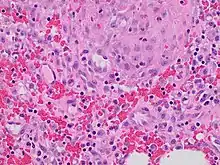 Granulation tissue is new connective tissue and microscopic blood vessels that form on the surfaces of a wound during the healing process.[1] Granulation tissue typically grows from the base of a wound and is able to fill wounds of almost any size. Examples of granulation tissue can be seen in pyogenic granulomas and pulp polyps. Its histological appearance is characterized by proliferation of fibroblasts and thin-walled, delicate capillaries (angiogenesis), and infiltrated inflammatory cells in a loose extracellular matrix.