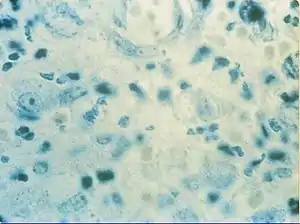 They appear deep purple when stained with Wright's stain.[8] These intracellular inclusions are the encapsulated Gram-negative rods of the causative organisms.[8] They were discovered by Charles Donovan.[9]