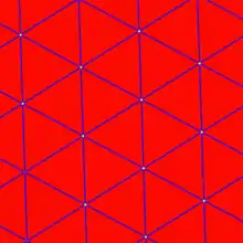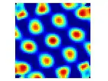 Grid cells that lie next to one another (i.e., cells recorded from the same electrode) usually show the same grid spacing and orientation, but their grid vertices are displaced from one another by apparently random offsets. Cells recorded from separate electrodes at a distance from one another, however, frequently show different grid spacings. Cells that are located more ventrally (that is, farther from the dorsal border of the MEC) generally have larger firing fields at each grid vertex, and correspondingly greater spacing between the grid vertices.[1] The total range of grid spacings is not well established: the initial report described a roughly twofold range of grid spacings (from 39 cm to 73 cm) across the dorsalmost part (upper 25%) of the MEC,[1] but there are indications of considerably larger grid scales in more ventral zones. Brun et al. (2008) recorded grid cells from multiple levels in rats running along an 18-meter track, and found that the grid spacing expanded from about 25 cm in their dorsalmost sites to about 3 m at the ventralmost sites.[14] These recordings only extended 3/4 of the way to the ventral tip, so it is possible that even larger grids exist. Such multi-scale representations have been shown to be information theoretically desirable.[15]