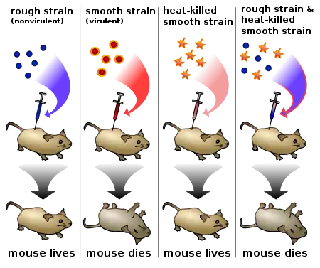 Griffith's experiment,[1] reported in 1928 by Frederick Griffith,[2] was the first experiment suggesting that bacteria are capable of transferring genetic information through a process known as transformation.[3][4] Griffith's findings were followed by research in the late 1930s and early 40s that isolated DNA as the material that communicated this genetic information.