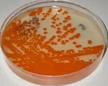 GBS grows readily on blood agar plates as colonies surrounded by a narrow zone of β-hemolysis. GBS is characterized by the presence in the cell wall of the antigen group B of Lancefield classification (Lancefield grouping) that can be detected directly in intact bacteria using latex agglutination tests.[8][9] The CAMP test is also another important test for identification of GBS. The CAMP factor produced by GBS acts synergistically with the staphylococcal β-hemolysin inducing enhanced hemolysis of sheep or bovine erythrocytes.[8] GBS is also able to hydrolyze hippurate and this test can also be used to identify presumptively GBS.[8] Hemolytic GBS strains produce an orange-brick-red non-isoprenoid polyene (ornithine rhamnolipid) pigment (granadaene)[10] when cultivated on granada medium that allows its straightforward identification.[11] GBS can also be identified using MALDI-TOF (Matrix Assisted Laser Desorption/Ionization-Time of Flight) instruments.[12] GBS colonies can additionally be identified tentatively after their appearance in chromogenic agar media, nevertheless GBS-like colonies that develop in chromogenic media should be confirmed as GBS using additional reliable tests (e.g.latex agglutination or the CAMP test) to avoid potential mis-identification.[9][13][14] A summary of the laboratory techniques for GBS identification is depicted in Ref 7. [9]