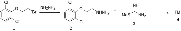 When β-(2,6-dichlorophenoxy)ethyl bromide (1) is reacted with hydrazine to give 2, and this is reacted with S-methylthiourea, guanochlor (3) results.[2][3]