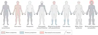 A number of subtypes of Guillain–Barré syndrome are recognized.[5][40] Despite this, many people have overlapping symptoms that can make the classification difficult in individual cases.[6][41] All types have partial forms. For instance, some people experience only isolated eye-movement or coordination problems; these are thought to be a subtype of Miller Fisher syndrome and have similar antiganglioside antibody patterns.[11][41]