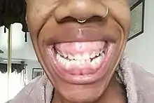 Gummy smile, also known as excessive gingival display, is a smile that shows an excessive amount of gum under the upper lip. It is a common unaesthetic clinical condition, which can be caused by an abnormal dental eruption (delayed passive eruption), hyperfunction of the upper lip elevator muscle, excessive vertical growth of the maxilla bone, over-eruption of the maxillary anterior teeth, or a combination of the above described factors.[1][2] Several treatment options have been proposed to enhance the smile display and to reduce the gingival exposure.[3]