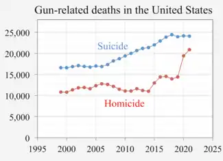 There is a strong relationship between guns in the home, as well as access to guns more generally, and suicide risk, the evidence for which is strongest in the United States.[23][24] In 2017, almost half of the nation's 47,173 suicides involved a firearm.[25] A 1992 case-control study conducted in Tennessee and Washington found that individuals in a firearm owning home are close to five times more likely to commit suicide than those individuals who do not own firearms.[26] A 2002 study found that access to guns in the home was associated with an increased risk of suicide among middle-aged and older adults, even after controlling for psychiatric illness.[27] As of 2008, there were 12 case-control studies that had been conducted in the U.S., all of which had found that guns in the home were associated with an increased risk of suicide.[28] However, a 1996 New Zealand study found no significant relationship between household guns and suicide.[29] Assessing data from 14 developed countries where gun ownership levels were known, the Harvard Injury Control Research Center found statistically significant correlations between those levels and suicide rates. However, the parallels were lost when data from additional nations was included.[30]: 30 A 2006 study found a significant effect of changes in gun ownership rates on gun suicide rates in multiple Western countries.[31] During the 1980s and 1990s, the rate of adolescent suicides with guns caught up with adult rates, and the 75-and-older rate rose above all others.[10]: 20–21 [32] A 2002 study found that 90% of suicide attempts with firearms were successful.[33]