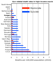 The United States has the 11th highest rate of gun violence in the world and a gun homicide rate which is 25 times higher than the average respective rates of other high income nations.[7][8] The United States has a total rate of firearms death which is 50–100 times greater than that of many similarly wealthy nations with strict gun control laws, such as Japan, the United Kingdom, and South Korea.[8] Nearly all studies have found a positive correlation between gun ownership and gun-related homicide and suicide rates.[9][10]: 29 [11]