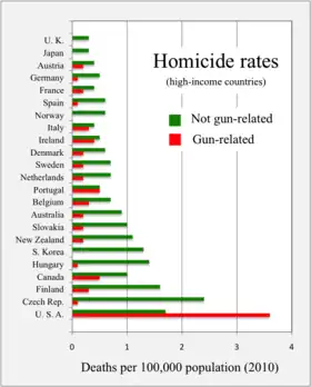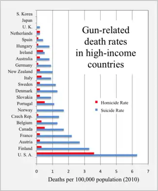 The U.S. is ranked 4th out of 34 developed nations for the highest incidence rate of homicides committed with a firearm, according to Organisation for Economic Co-operation and Development (OECD) data. Mexico, Turkey, Estonia are ranked ahead of the U.S. in incidence of homicides. However, according to comprehensive research by the University of Sydney, the firearm related homicide rates in Estonia and Turkey are both below the US (0.78 in Turkey and 0 in Estonia , while 5.9 in the US), with Estonia registering zero in 2015.[131] A U.S. male aged 15–24 is 70 times more likely to be killed with a gun than their counterpart in the eight (G-8) largest industrialized nations in the world (United Kingdom, France, Germany, Japan, Canada, Italy, Russia).[132] In a broader comparison of 218 countries the U.S. is ranked 111.[133] In 2010, the U.S.' homicide rate is 7 times higher than the average for populous developed countries in the OECD, and its firearm-related homicide rate was 25.2 times higher.[134] In 2013, the United States' firearm-related death rate was 10.64 deaths for every 100,000 inhabitants, a figure very close to Mexico's 11.17, although in Mexico firearm deaths are predominantly homicides whereas in the United States they are predominantly suicides.[135] (Although Mexico has strict gun laws, the laws restricting carry are often unenforced, and the laws restricting manufacture and sale are often circumvented by trafficking from the United States and other countries.[136]) Canada and Switzerland each have much looser gun control regulation than the majority of developed nations, although significantly more than in the United States, and have firearm death rates of 2.22 and 2.91 per 100,000 citizens, respectively. By comparison Australia, which imposed sweeping gun control laws in response to the Port Arthur massacre in 1996, has a firearm death rate of 0.86 per 100,000, and in the United Kingdom the rate is 0.26. In the year of 2014, there were a total of 8,124 gun homicides in the U.S.[137] In 2015, there were 33,636 deaths due to firearms in the U.S, with homicides accounting for 13,286 of those, while guns were used to kill about 50 people in the U.K., a country with population one fifth of the size of the U.S. population.[132] More people are typically killed with guns in the U.S. in a day (about 85) than in the U.K. in a year, if suicides are included.[132] With deaths by firearm reaching almost 40,000 in the U.S. in 2017, their highest level since 1968, almost 109 people died per day.[10] A study conducted by the Journal of the American Medical Association in 2018, states that the worldwide gun death reach 250,000 Yearly and the United States is among only six countries that make up half of those fatalities.[138][139] According to the Small Arms Survey, there are about 120 guns for every 100 Americans. In other words, there are more civilian guns in the United States than people. The rate of deaths from gun violence in the United States is eight times greater than in Canada, which has the seventh-highest rate of gun ownership in the world.[140]