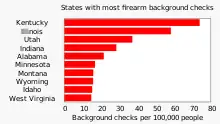 Gun dealers in the U.S. are prohibited from selling handguns to those under the age of 21, and long guns to those under the age of 18.[199] In 2017, the National Safety Council released a state ranking on firearms access indicators such as background checks, waiting periods, safe storage, training, and sharing of mental health records with the NICS database to restrict firearm access.[231]
