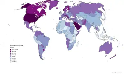 Gun ownership figures are generally estimated via polling, by such organizations as the General Social Survey (GSS), Harris Interactive, and Gallup. There are significant disparities in the results across polls by different organizations, calling into question their reliability.[23] In Gallup's 1972 survey, 43% reported having a gun in their home, while GSS's 1973 survey resulted in 49% reporting a gun in the home; in 1993, Gallup's poll results were 51%, while GSS's 1994 poll showed 43%.[24] In 2012, Gallup's survey showed 47% of Americans reporting having a gun in their home,[25] while the GSS in 2012 reports 34%.[24] In 2018 it was estimated that U.S. civilians own 393 million firearms,[26] and that 40% to 42% of the households in the country have at least one gun. However, record gun sales followed in the following years.[27][28][29]