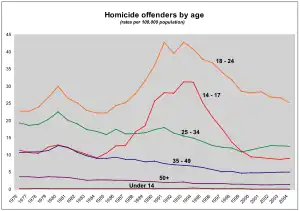 In 2005, the 17-24 age group was significantly over-represented in violent crime statistics, particularly homicides involving firearms.[108] In 2005, 17–19-year-olds were 4.3% of the overall population of the U.S.[109] but 11.2% of those killed in firearm homicides.[110] This age group also accounted for 10.6% of all homicide offenses.[111] The 20-24-year-old age group accounted for 7.1% of the population,[109] but 22.5% of those killed in firearm homicides.[110] The 20-24 age group also accounted for 17.7% of all homicide offenses.[111]