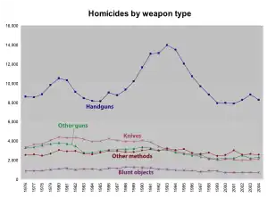 In the 19th century, gun violence played a role in civil disorder such as the Haymarket riot.[93] Homicide rates in cities such as Philadelphia were significantly lower in the 19th century than in modern times.[94] During the 1980s and early 1990s, homicide rates surged in cities across the United States (see graphs at right).[95] Handgun homicides accounted for nearly all of the overall increase in the homicide rate, from 1985 to 1993, while homicide rates involving other weapons declined during that time frame.[38] The rising trend in homicide rates during the 1980s and early 1990s was most pronounced among lower income and especially unemployed males. Youths and Hispanic and African American males in the U.S. were the most represented, with the injury and death rates tripling for black males aged 13 through 17 and doubling for black males aged 18 through 24.[96][82] The rise in crack cocaine use in cities across the U.S. has been cited as a factor for increased gun violence among youths during this time period.[97][98][99] After 1993, however, gun violence in the United States began a period of dramatic decline.[100][81]