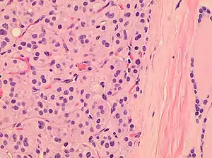 This mass can be detected and removed before transformation and metastasis. The tumor is often detected by imaging such as ultrasound. The location and size of the tumor may cause pressure and pain to the patient. But often the tumor goes undetected. After detection, the mass is tested using an invasive fine-needle aspiration biopsy.[5] Hürthle cell adenoma is the benign analogue of Hürthle cell carcinoma. This adenoma is extremely rare; when it occurs, it usually occurs in women. Often the adenoma is harmless but is removed after detection because its future course cannot be trusted.[2][3]