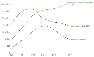 | Frequency | 64.4 million – 113 million total cases[8] 1.5 million new cases (2021)[8] 38.4 million living with HIV (2021)[8] |