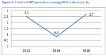 The latest integrated bio-behavioral surveillance (IBBS) (2018), conducted in three major cities of the country (Yerevan, Gyumri and Vanadzor) came up with aggregated HIV prevalence among MSM of 1.9% (2.7% in capital city of Yerevan), which is lower than HIV prevalence among MSM in other countries of the region. Moreover, while HIV prevalence among MSM has steadily increased in all countries of EECA, it has been relatively stable among MSM in Armenia (2.5% in 2012 to 2.7% in 2016). HIV prevalence among trans people in Armenia was at 2%.[5]