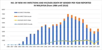 Malaysia is ranked seventh highest in adult prevalence of HIV/AIDS in Asia after Thailand, Papua New Guinea, Burma, Cambodia, Vietnam and Indonesia with a 0.45% prevalence rate.[3] According to the United Nations, Malaysia is one of the ten countries which together accounted for over 95% of all new HIV infections in the region of Asia-Pacific in 2016.[4]