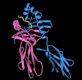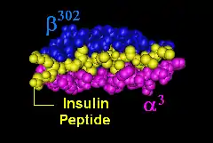 ![]() Rendering of HLA-DQ8 with immundominant insulin peptide in the binding pocket. | |||||||||||||||||